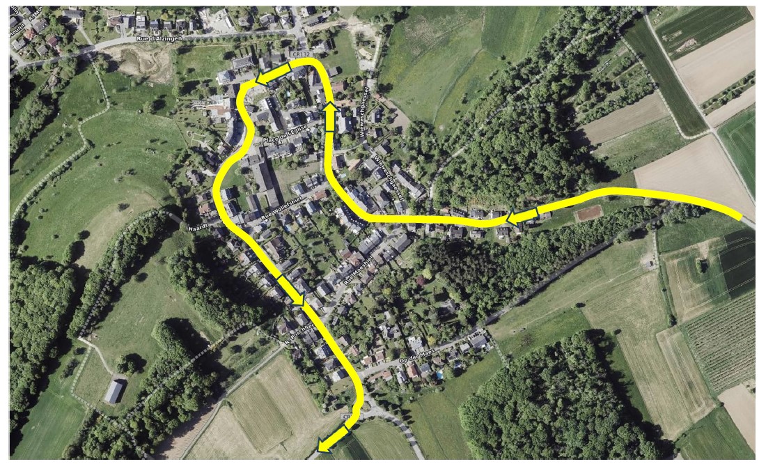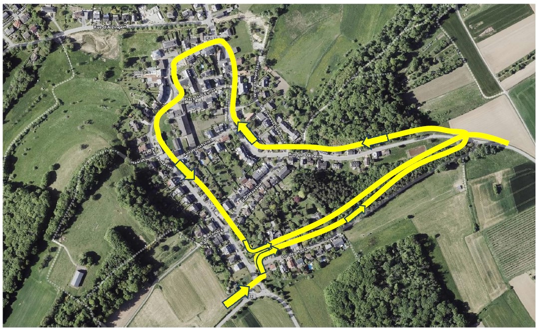 Les courses d’autobus concernées seront déviées après la desserte de l’arrêt Syren Klappsbréck via la rue de Dalheim – rondpoint 2ième sortie rue de Hassel – Syren-Nidderbaach provisoire, -Rue de Hassel – rondpoint 1ière sortie – CR132 en direction de Hassel – à droite CR162 en direction Alzingen – à droite N3 suite itinéraire normal.