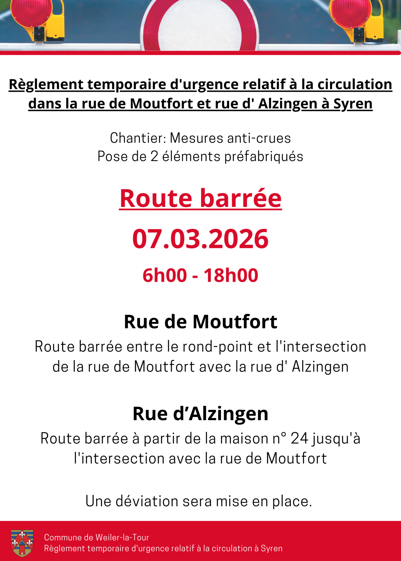 Règlement temporaire d’urgence relatif à la circulation dans la rue de Moutfort et rue d’ Alzingen à Syren