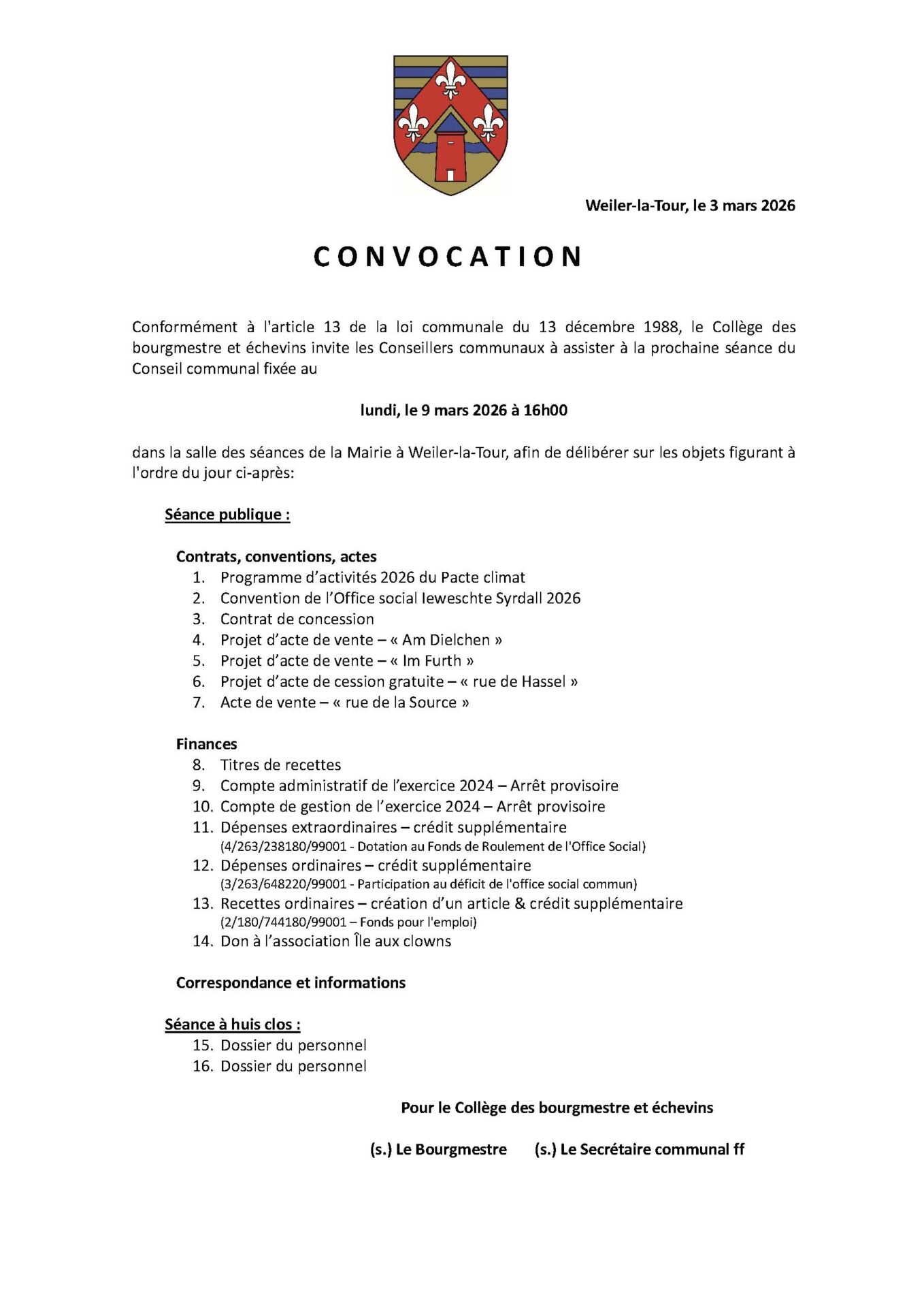 Conformément à l’article 13 de la loi communale du 13 décembre 1988, le Collège des bourgmestre et échevins invite les Conseillers communaux à assister à la prochaine séance du Conseil communal fixée au